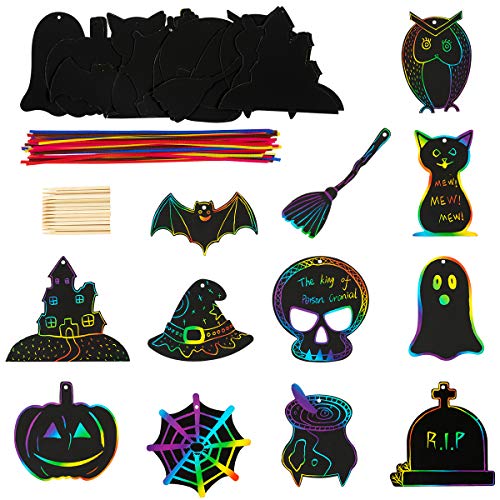 Rainbow Scratch Art Paper Card Pumpkin Bat Castle Hats Craft Kit with 24pcs Wooden Styluses and 48pcs Ribbons for Birthday Halloween Party Supplies! specification: – color: colorful – material: premium paper – quantity: total 120pcs accessories-types:scratch paper application: – perfect for holiday parties, kids birthday parties, home ornaments, gifts bag favors,halloween party supplies-how to...