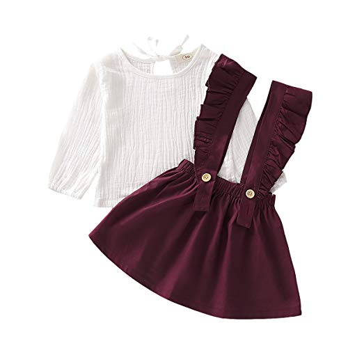 Product Features 💗 Cotton Blend, soft and comfortable 💗 White shirts, linen long sleeve shirts, back strap, red wine skirt, ruffle sleeve, suapender dress 💗 Suit for toddler girls 1-2t 2-3t 3-4t 4-5t 5-6t, your baby will love wear this adorable outfits 💗 Great for your little Princess playwear, take photo, birthday gift, party,...