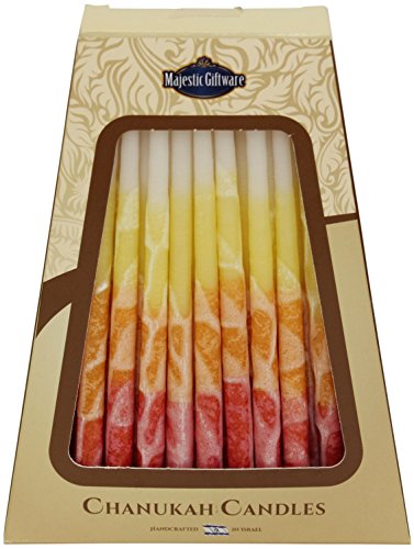 These dripless, beautiful candles have beautiful complexity of red, orange, yellow, and white; with an overlay design giving them a partially marbled appearance. 45 hand dipped candles with hand applied accents. Each one is hand dipped in the holy city of Safed. These gorgeous candles will be a beautiful treat to your Hanukkah menorah....