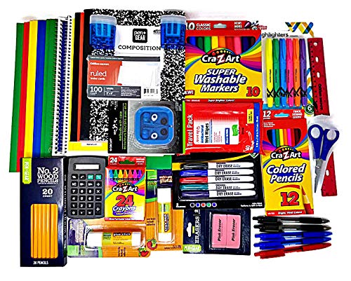 Basic school supplies bundle includes 20 Cra-Z-Art #2 pencils, 2 large glue sticks, 10 Cra-Z-Art washable markers, 12 Cra-Z-Art colored pencils, 2 Smart Start Pencil Sharpeners, 40 Assured antibacterial wet wipes, 24 Cra-Z-Art crayons, 5 Academix dry erase markers, 2 large pink erasers, 2 70-sheet spiral wide ruled notebook, 2 wide ruled composition notebook,...