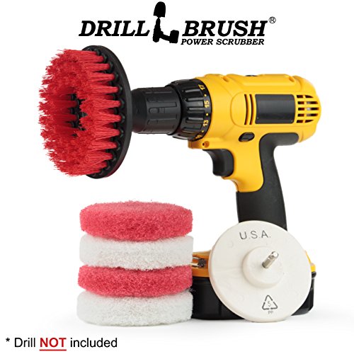 Drill is NOT included. 5 piece Drill Powered Brush and Scrubbing Pad Kit. 5 inch diameter flat red scrubbing brush works great on porcelain tubs for tough stains or soap scum buildup. Flat brush is perfect for tile and showers. Drill powered 4 inch hook and loop backer pad fits any cordless drill. Four...