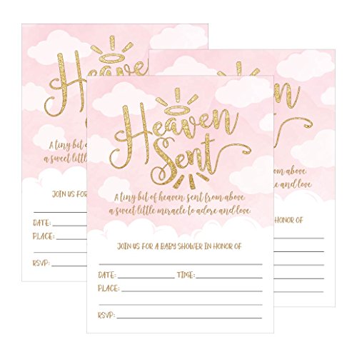 Heavenly pink and fake gold foil design for your little girl Heaven Sent baby shower theme, with a wonderful religious theme. Cloud accents on top. Your guests will love these! Product Features Pink and Gold Heaven Sent Baby Shower Invitations for Girls Includes 10 invitations and 10 blank white envelopes 4″ x 6″ Flat...