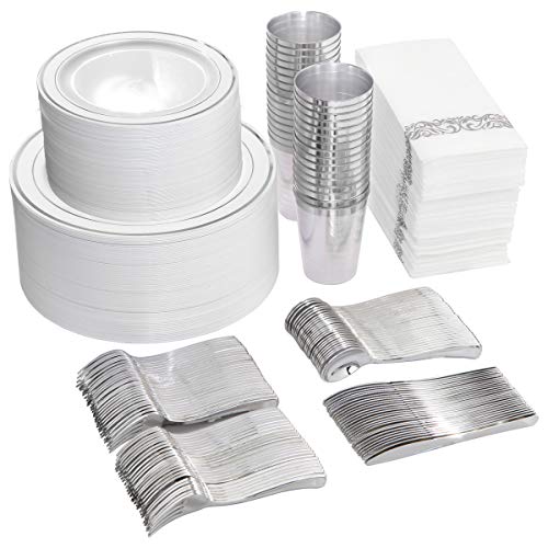 EASY To Set Your Table Perfectly with Little Effort A NICE GIFT: Having a difficult time finding a gift for your family or friends? This silver plastic silverware, cups, plates and napkins are perfect for any occasion. CONVENIENT: These premium plastic silver plates with silver plastic utensils will make self-service lunches particularly simple because...