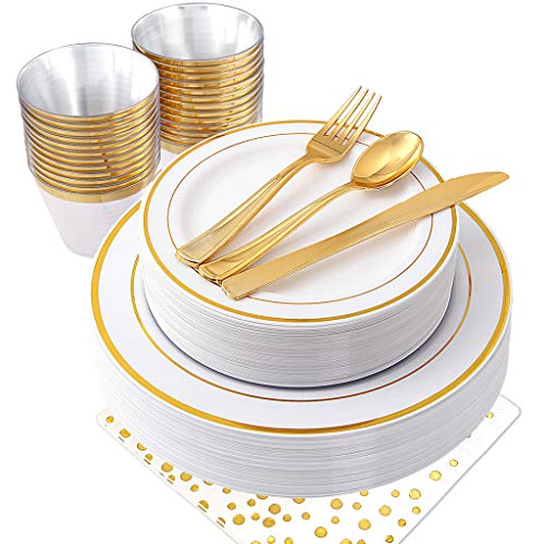 Specification: Dinner plates Size: 10.25inch Dessert plates size: 7.5inch Knife size: 7.87inch Fork size: 7.4inch Spoon size: 6.89inch Cup size: 10oz Napkins size:13*13inch Weight: 7.7lb/pack Color: gold Material: PS Product Description: NERVURE- We are focus on quality of life,providing premium products and making life more interesting. Hazard-free, BPA-free and Food grade plastic Spend more...