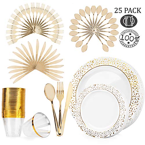Dinner Party Ready No matter breakfast, lunch, or dinner this plastic dinnerware set will fit all your needs with two plates, a cup, and silverware set for 25 people Quick & Convenient These gold glitter party plates and cups offer the quickest, easiest way to serve parties, weddings, mitzvahs, luncheons, family gatherings, engagement parties,...