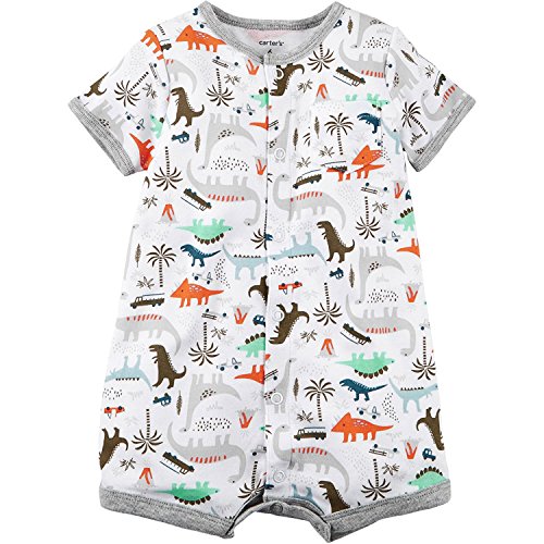 This romper from Carter’s features a stylish dinosaur print and a solid trim to keep him comfy all day. Product Features Cotton Crew neck Short sleeves Snap up front closures Allover dinosaur print