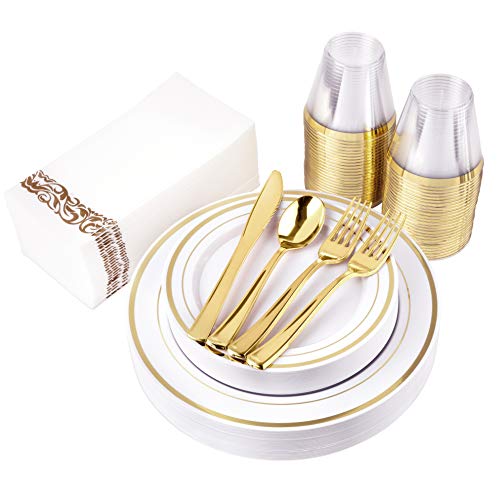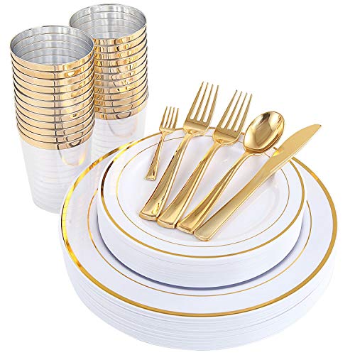 Product Features PREMIUM QUALITY: 100% food grade, non-toxic, BPA-free plastic! Those gold plastic tableware set is safe you and your guests. Solid, durable, heavy duty gold plates,gold plastic silverware and gold cups ensure won’t scratch or break easily. ELEGANT DESIGN:This gold plastic silverware looks like the real gold look. The wedding plates and disposable...