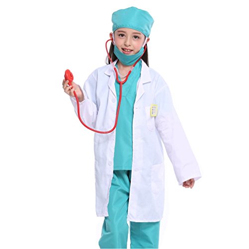 Ideal gift to your kids for Halloween Christmas Brithday. Perfect dress up set for your kids to role play for doctor or scientist. Package includes: 1 x doctor coat 1 x stethoscope 1 x write name tag Size: shoulder:14″ chest/bust measurement:34.6″, coat length:26″. Fits most children ages 3-7 Product Features Material of the Coat-...