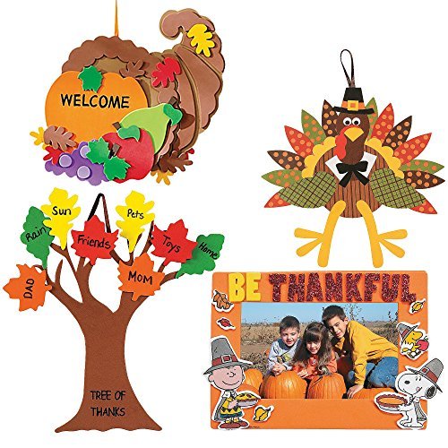 You will receive 4 craft kits; 1 “tree of thanks” craft kit, 1 peanuts® thanksgiving picture frame craft kit, 1 turkey craft kit & 1 foam cornucopia door sign craft kit. Foam cornucopia door sign, containing medium-sized pieces with the occasional angular edge. Lightweight to sturdy crafts require some assembly to create a 3-dimensional...