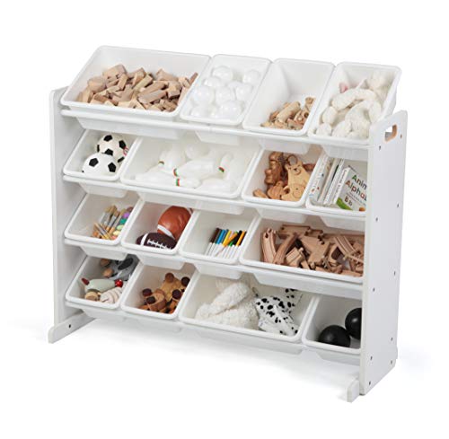 The space-saving super-sized toy organizer with 16 plastic white bins offers storage ideal for organizing your child’s bedroom, playroom, nursery or the living room. Includes 12 standard-sized and 4 large bins, easy access storage containers are removable, making it fun for boys and girls to take out toys, books and games for playtime and...