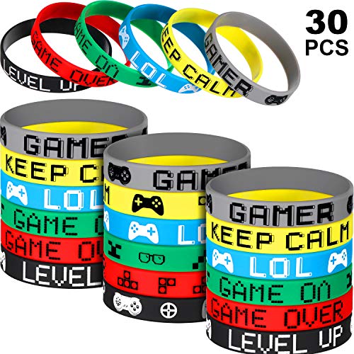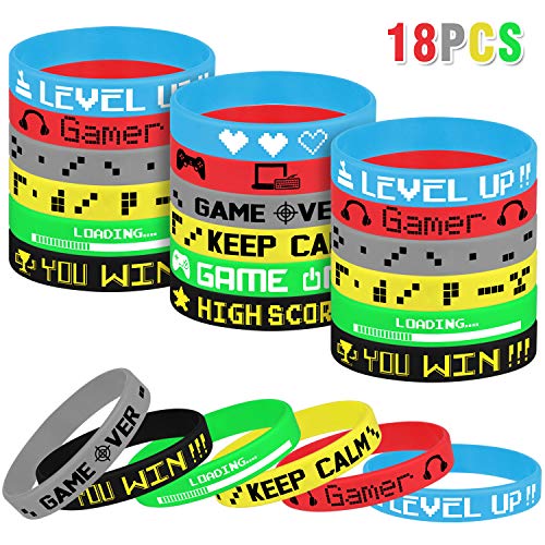 Video Game Theme Bracelets! These rubber wristbands have 6 different styles, printed with video game theme patterns and words( as the photo shown), fits most game theme parties, is your ideal party favors. Specification: Material: Silicone Diameter: 2.56 inches Width: 0.5 inches Patterns: 6 different patterns designed Quantity: 18pcs in total, 3pcs each pattern...