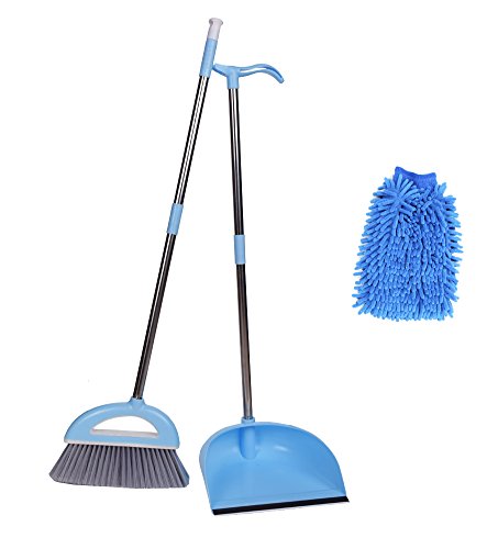 Product Size:Broom: 89cm x 27cmdustpan: 77cm x 25cm x 22.5cmCleaning Mitt:21cm x 16cm Product Meterial: Broom&dustpan: Plastic,TPRCleaning Mitt:Microfiber Chenille Product Color: Blue Product Features The Broom and dustpan can be knocked-down,Stands upright for comfortable sweeping The Chenille Mitt, is multi-function, it can be used for cleaning desk, window,car,etc.